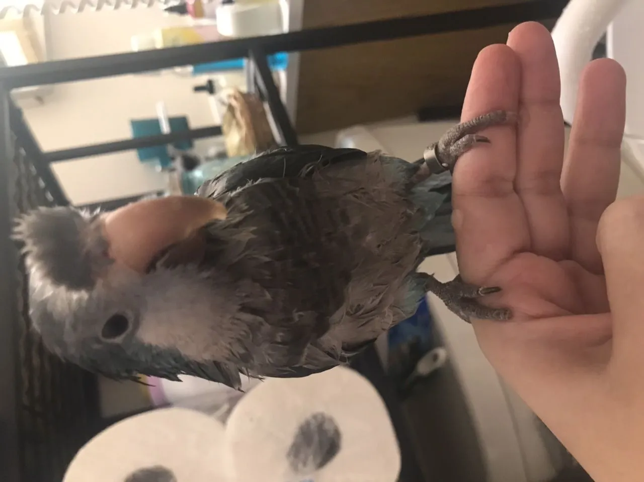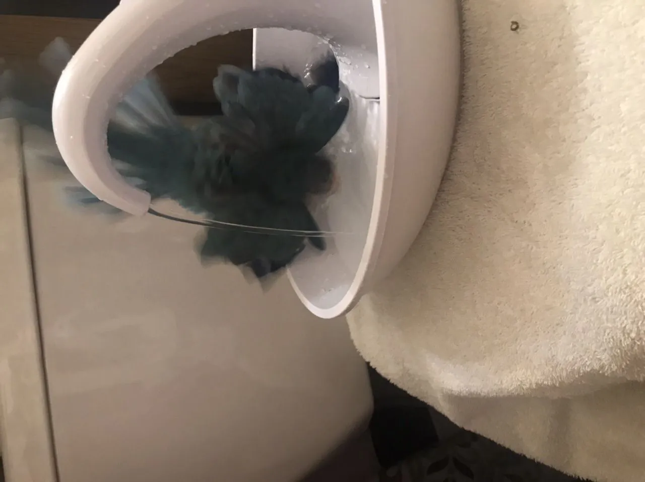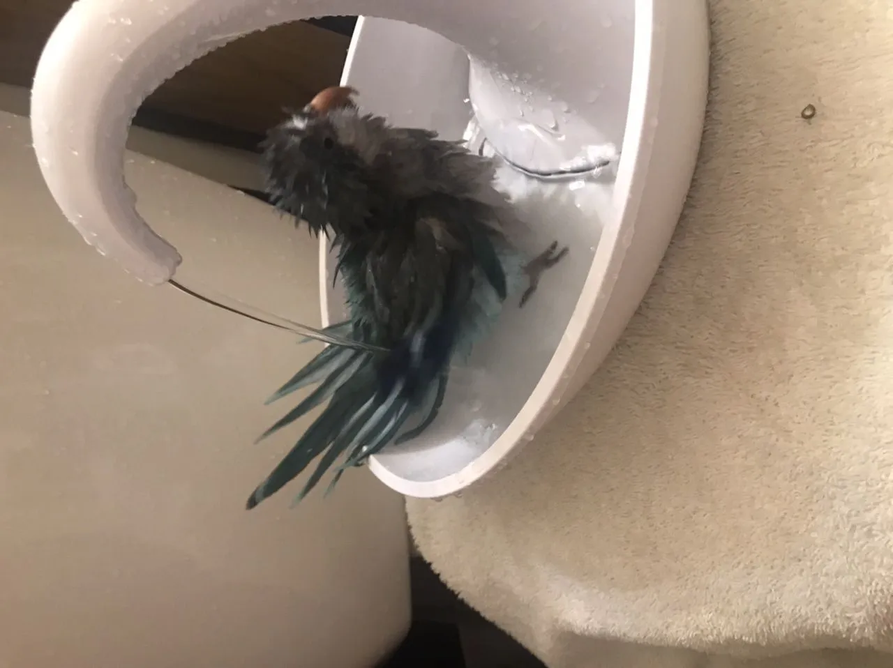 Got him mostly dry by patting the feathers and letting him cuddle on my chest under a towel. Willow doesn’t preen when he’s super wet; he shakes himself and sort of rattled his feathers. Now he is preening and Jasper is just babbling in his cage. Jasper is up next!I think the first photo captured the slip in, then photo two shows his tail nicely fanned, and three is the post-bath hairstyle.