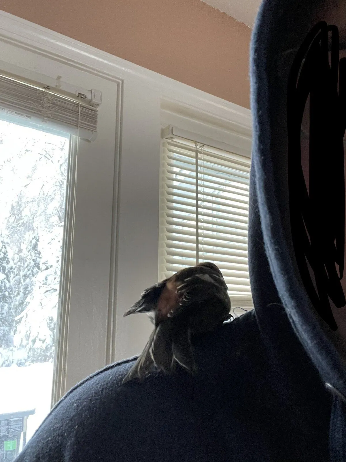 Absolutely! When I was changing his food earlier, he casually climbed up my sleeve and stared at me before fluttering to the couch. Heās rather tame for a wild bird⦠isnāt it bizarre?It looks like your new friend is settling in nicely! I realize you may be letting him go soon but you MUST name him!