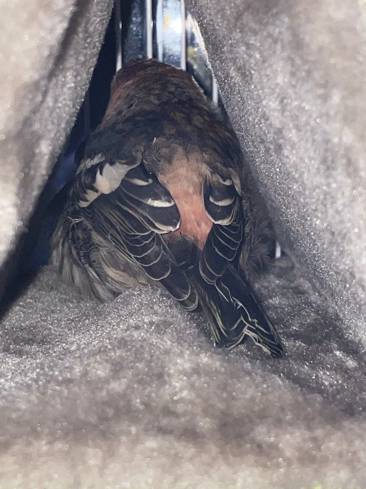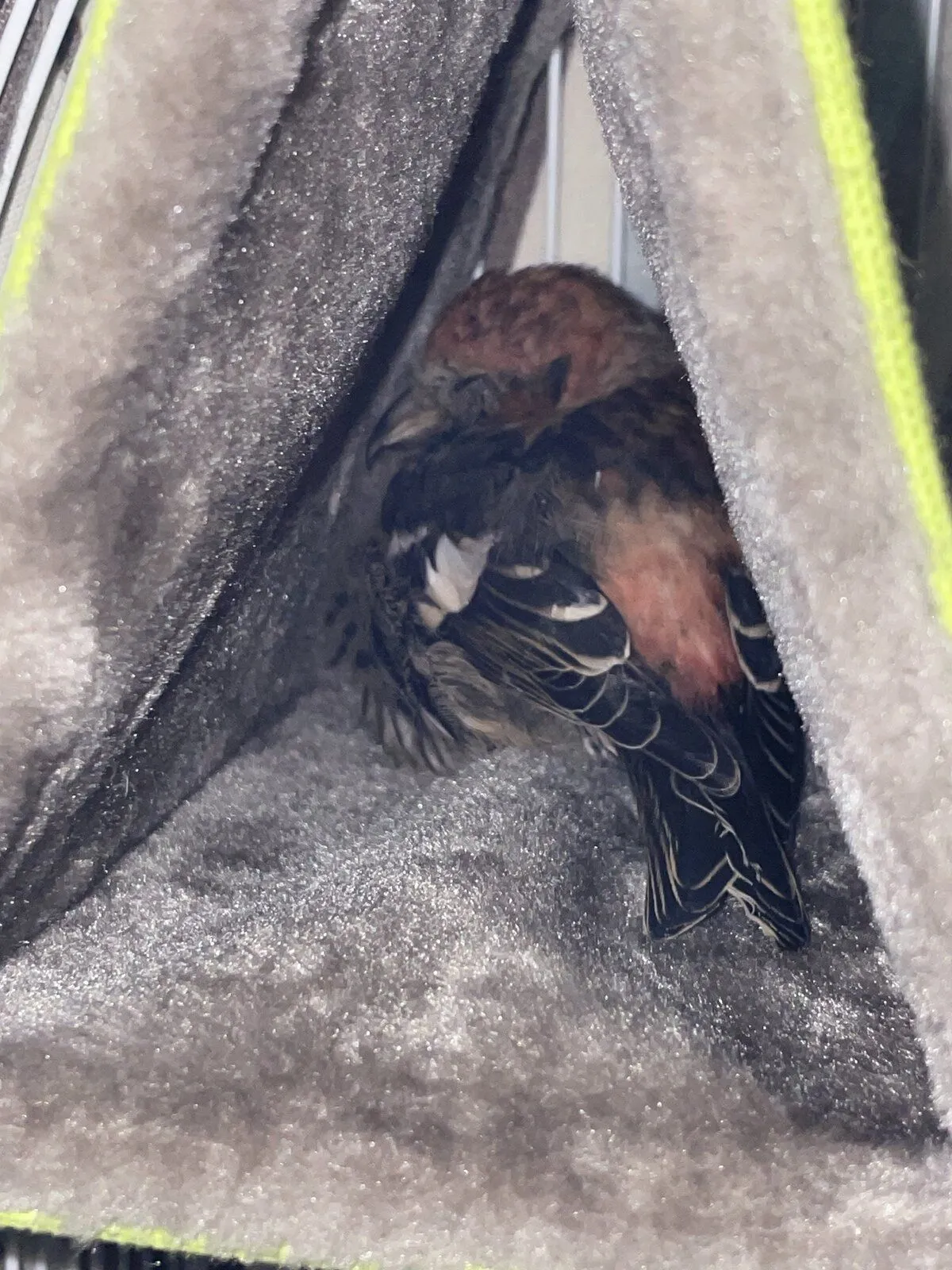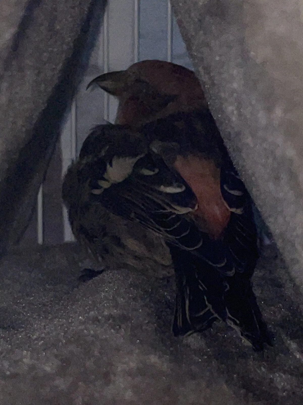 We found a white winged crossbill in the snow, near a window and he let me pick him up. Like, I just casually grabbed him and he was like “okie dokie then.”