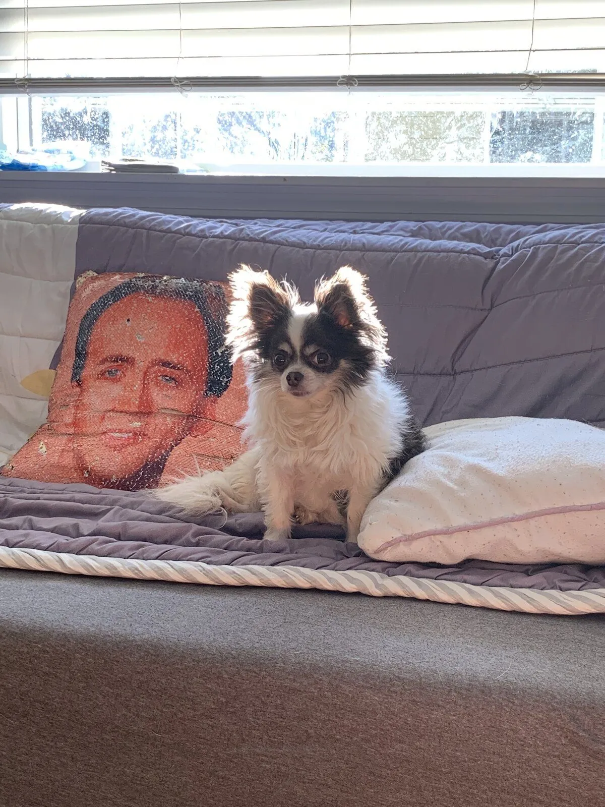 We also have a cat that I rescued from an animal-neglect situation at two weeks old, but she isn’t allowed in my work areas (Kirb Birb’s territory), because in addition to the obvious danger she’s a pain and gets into all my art supplies, walks all over my keyboards and knocks my paperwork over, etc lol. I have a bolt-style child-and-cat proof lock on Kirb’s door. We do have a dog bed in here, but I only let the dogs in when the weather is nice because they like to nap outside on the patio.