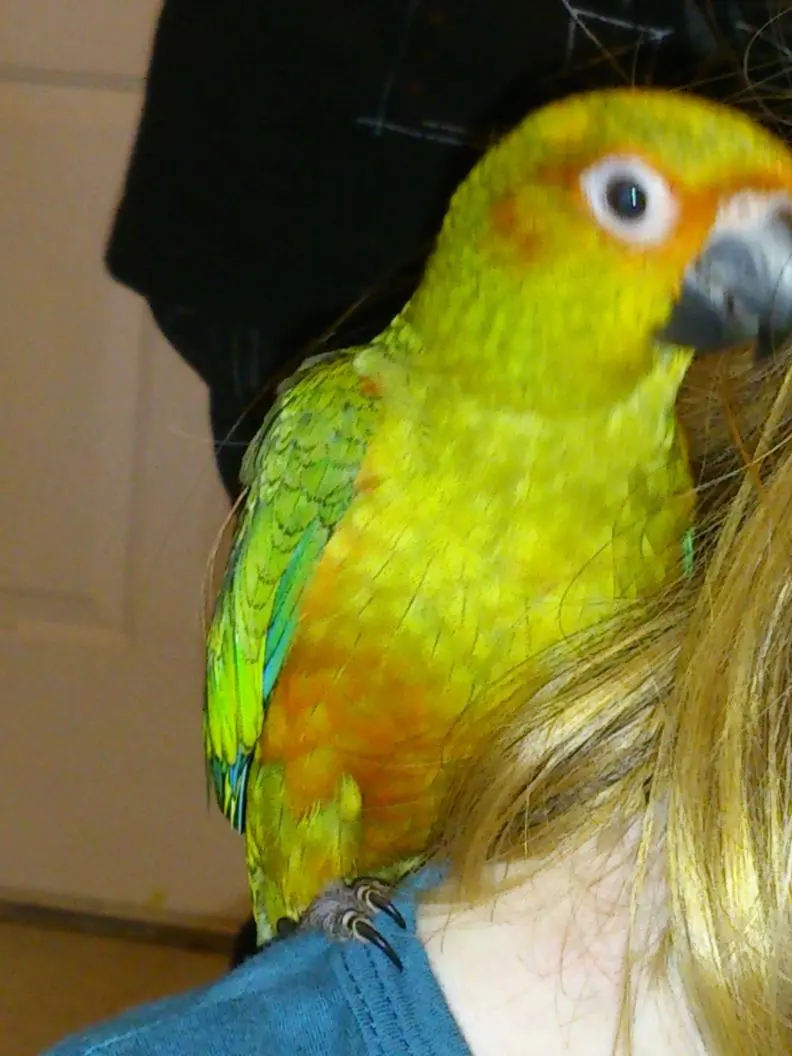 My baby is home already! I didn't realize conures were so goofy! I picked him up Saturday and he's such a character! He doesn't like paper in his cage so he will hang upside down and pick up seeds off the paper! Earlier today he was on the back of my chair and was attempting to climb between the wall and chair..LOL.. it was too funny! At first I thought something was wrong because he looked like he fell over on his back, then I realized what he was doing